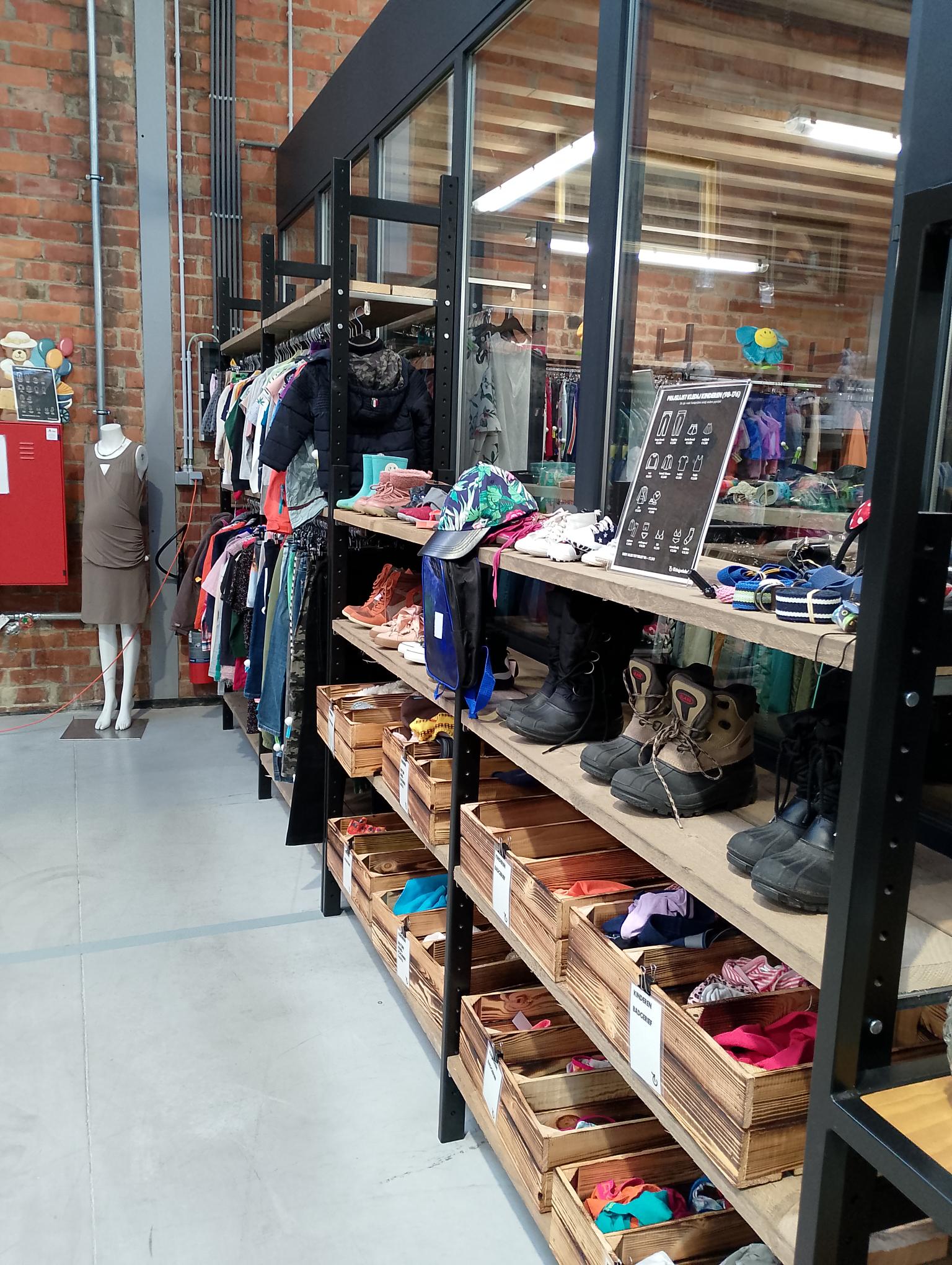 Deze Kringwinkel in België is ingericht met het Scafforek. Dit systeem bestaat uit steigerhouten legborden.